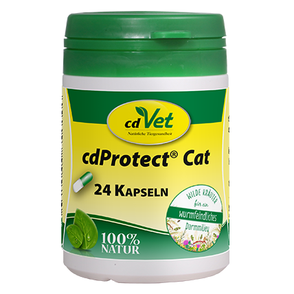 Oprócz zbilansowanej diety, należy stosować dodatek paszowy cdProtect® Cat, który rekompensuje brak składników ziołowych, takich jak saponiny, substancje gorzkie i garbniki. Ponadto wielu ekspertów w dziedzinie parazytologii zaleca sprawdzanie populacji robaków zwierzęcia poprzez regularne monitorowanie próbek kału.
